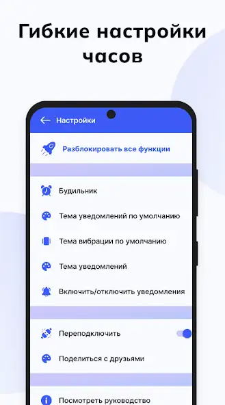 Имеется интерфейс на русском языке. Присутствует премиум-версия приложения с расширенными настройками и ускоренным процессом синхронизации. Доступно руководство по использованию программы. Есть раздел «Настройки» с пунктами: «Будильник», «Тема уведомлений по умолчанию», «Переподключить» и другими.