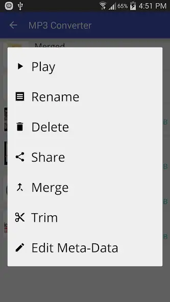 Video to MP3 Converter — конвертер видеороликов в аудиофайлы одноименного формата или AAC. Можно объединять две и более аудиодорожки, делиться ими с другими людьми. Доступен поиск по названиям, исполнителям. Контент отображается как список миниатюр с названиями, размерами, продолжительностью. Есть возможность запуска приложения в фоновом режиме. Присутствуют функции выбора, воспроизведения, переименования, удаления, совместного использования, обрезки материалов с указанием начала, конца фрагментов.