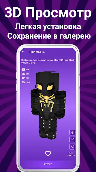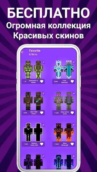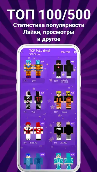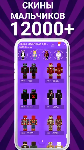 Присутствуют показ числа лайков, размеров файлов, отправка материалов другим людям. В приложении «Скины мальчиков для Майнкрафт» есть наряды аниматроников, астронавтов, приведений, гоблинов, циклопов, ученых, солдатов, мутантов, супергероев, зомби, трансформеров, мобов, рэперов, ассасинов и других. Контент показывается как список миниатюр с названиями, количеством просмотров.