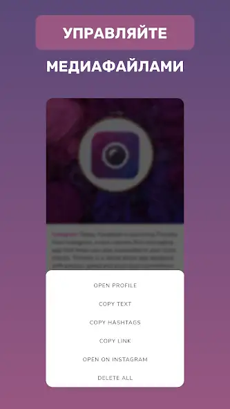 Позволяет отправлять сохраненные фото-, видеофайлы в директ, ленту, сторис или делиться ими через интернет, загружать два и более элемента одновременно. Можно просматривать загруженные файлы с информацией о постах и авторах в офлайн-режиме, удалять их; переходить на профили пользователей; копировать хэштеги, описания к публикациям. Присутствуют уведомления, встроенный поиск, выбор темы, например, темной или светлой. Есть реклама.