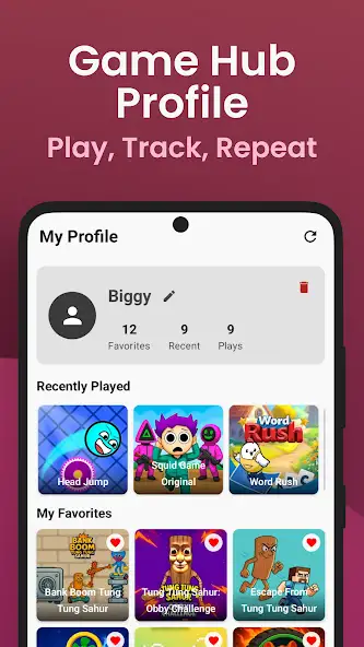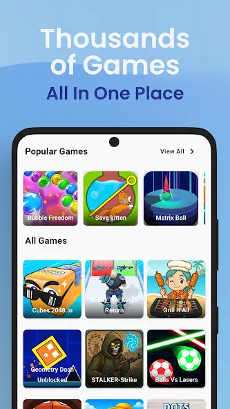 Имеются подборки по категориям, например, новым или популярным. Доступен встроенный поиск. Есть реклама, светлая и темная тема. Медиаконтент представлен в виде списка миниатюр. Возможно: создание, редактирование, удаление профиля; возвращение к недавно сыгранным играм и добавление их в избранное.