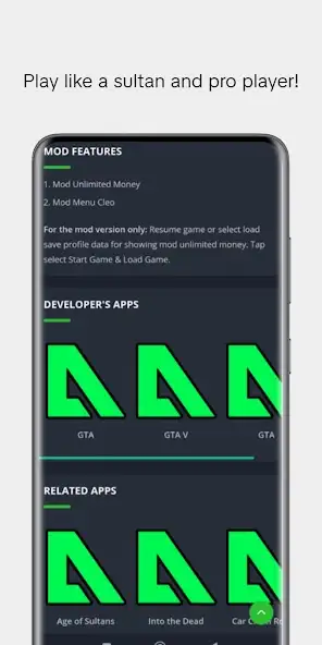Присутствуют описания модов. Имеется всплывающее меню, где показываются доступные привилегии. В приложении GAME MOD есть функция поиска. Интерфейс на русском языке отсутствует. Имеются ленты контента, например Related Apps. Можно делиться ссылкой на программу с другими пользователями. Поддерживаются вертикальная и горизонтальная ориентации экрана.
